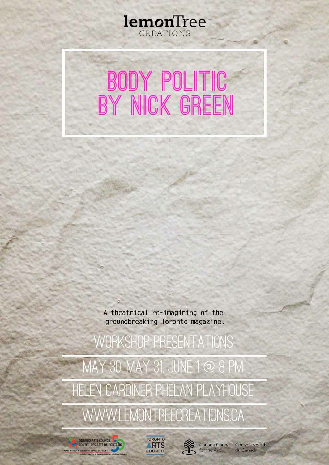 BODY POLITIC by NICK GREEN Who: lemonTree creationsWhen: MAY 30, MAY 31, JUNE 1, 2013 @ 8 pm