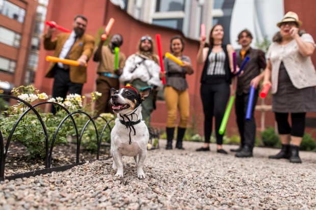 Scott Emerson Moyle: This is the third play I’ve staged in Berczy Park, but the first since a recent renovation that installed the notorious dog fountain. A site-specific staging has to respond to its location, and there was no avoiding the aesthetic of that gigantic fountain… and Shakespeare only put one live dog onstage, so there we were. I’d guess that the text is rarely staged because it has some serious problems with internal consistency (it often reads like a sloppy early draft), but I’d personally written it off because it normalizes misogyny and rape culture with its awful handling of Silvia’s story arc.