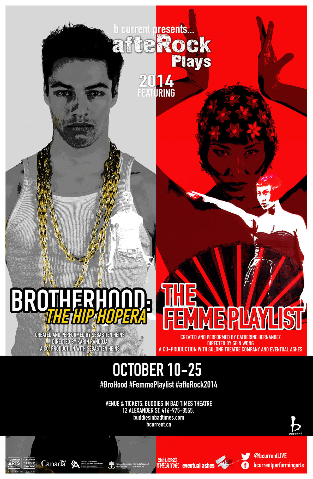 I interviewed Sébastien Heins and Catherine Hernandez about their solo shows, Brotherhood and Femme Playlist, playing at Buddies in Bad Times presented by b current as part of their afteROCK Plays series. They were both such a joy to interview. Their passion, gratitude and openness radiated as they spoke about their work. Catherine’s interjections with the children she cares for in her home daycare peppered our chat, “I’m feel like I’m the queer filipino version of Louis CK, children are very funny creatures and I approach my care of them with honour and humour.” And Sébastien had me laughing with his enthusiasm and bashfulness when discussing the title, and the creation, of his piece’s opening song, “Threesome with my bro.” #BroHood and #FemmePlaylist captivated me with each performance’s tremendous energy and detail. I had the pleasure of witnessing their creations and hope that many of you will too.
