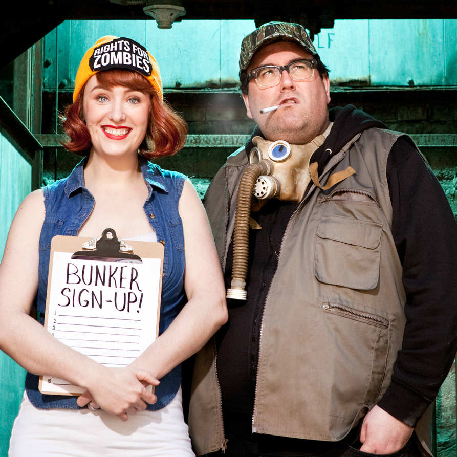 Clare Blackwood: Welcome to the Bunker! is an immersive post-apocalyptic zombie comedy set deep “under” the Theatre Passe Muraille Backspace. Katie, a zombie rights millennial activist, and Todd, an antisocial Gen-X prepper, have holed up in Todd’s bunker after North America has been overrun by the undead and left for…well, dead by the rest of the world. Naturally, Katie has decided that the best thing to do in this situation is to collect as many survivors as possible and bring them down into the bunker, in order to create a harmonious new society when the whole “zombie thing” has died down (pun very much intended). Together, they’ll take each audience of survivors through a very enthusiastic-yet-half-assed apocalypse orientation… that is, unless that scratching in the walls gets any louder…